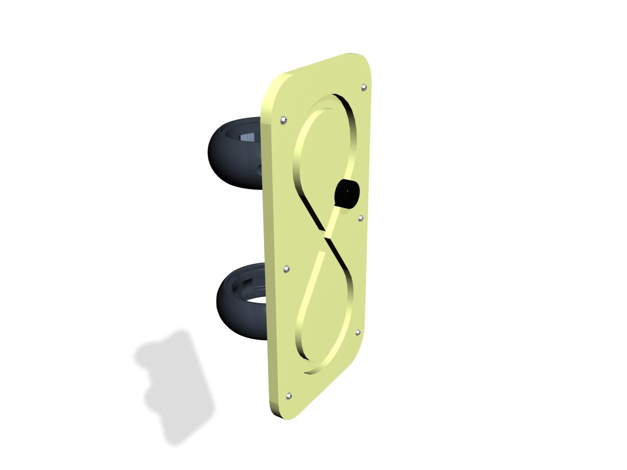 Le module Mouvement en 8 (poteau en option) est un panneau de polyéthylène avec canal rainuré par lequel peut circuler une pièce mobile dans un circuit sous forme de huit. Ceci permet le travail combiné des bras, des mains, des poignets et des doigts.